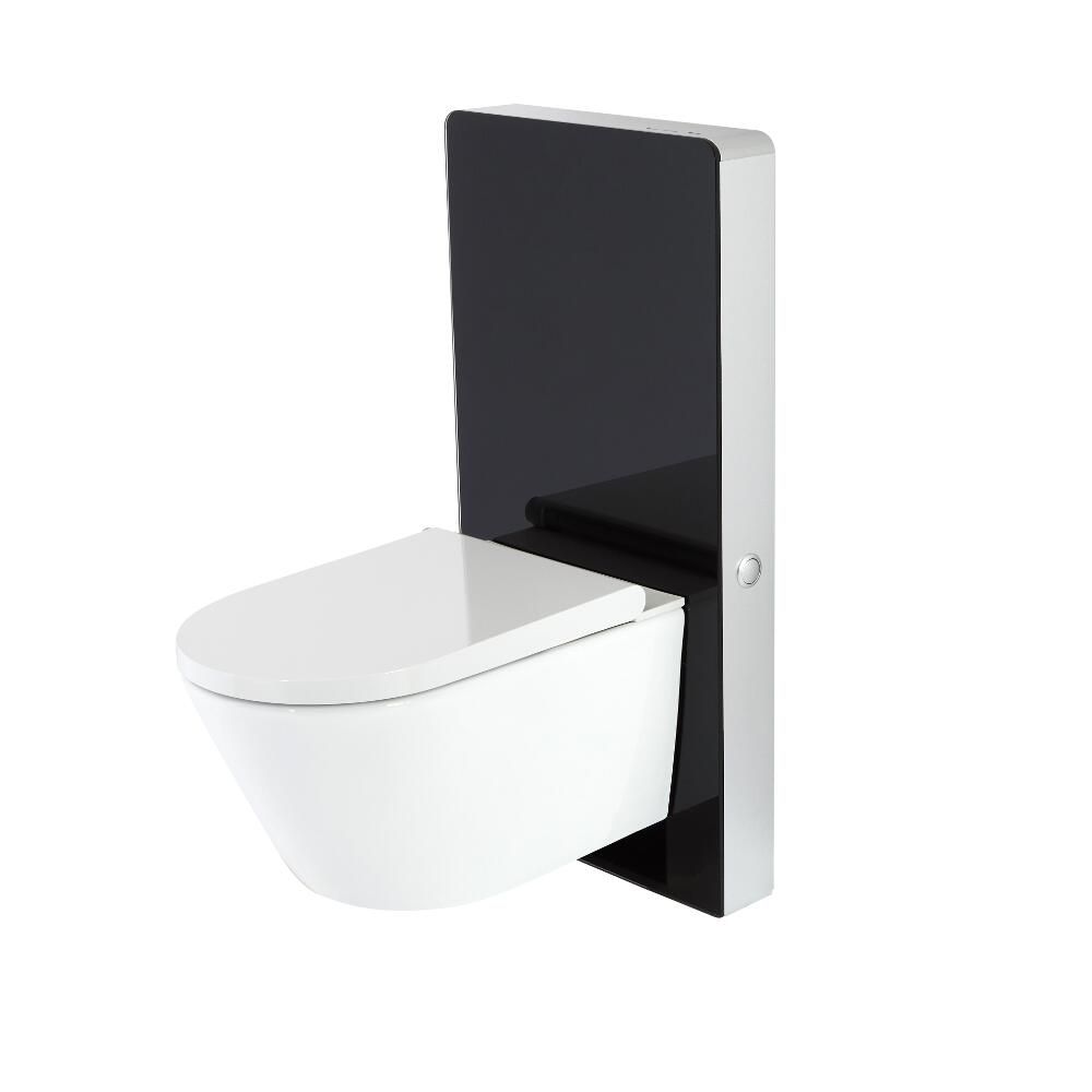 The super-sleek WC unit features a black tempered glass panel and a durable aluminium frame. The included water-saving HDPE dual flush cistern is operated by using the hands-free sensor, ensuring ease of use and helping to prevent the spread of germs. The unit hides the cistern and pipework, creating a minimal look.