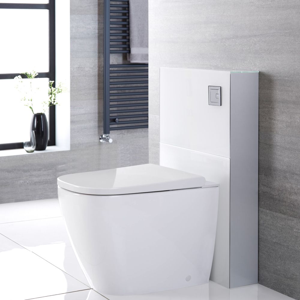 The sleek WC unit features white tempered glass panels and a durable aluminium frame, creating a contemporary look. The included water-saving HDPE dual flush cistern is operated by using the chrome effect push button. The unit conceals the pipework and the cistern, ensuring a neat and tidy finish.