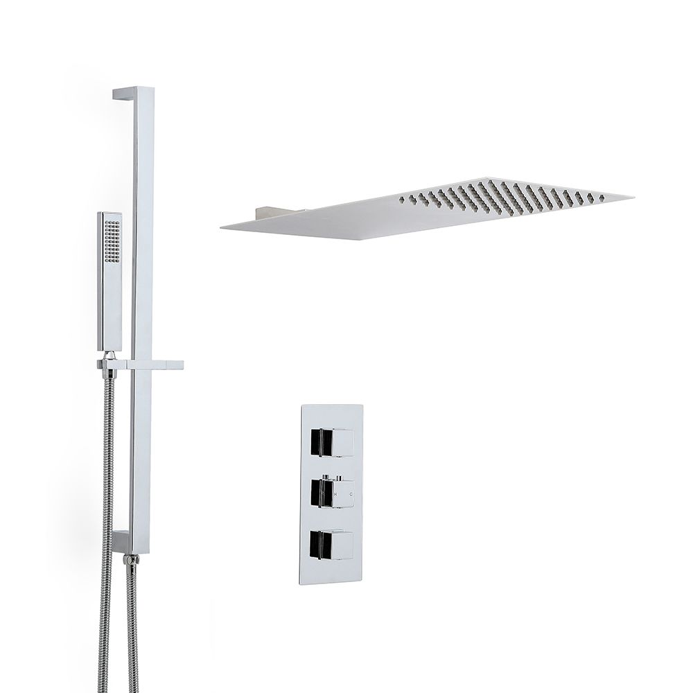 The Milano Arvo thermostatic shower is the perfect choice for bringing contemporary style to your bathroom. The Arvo shower mixer set comes with the triple thermostatic shower valve, thin rainfall shower head and riser rail kit.