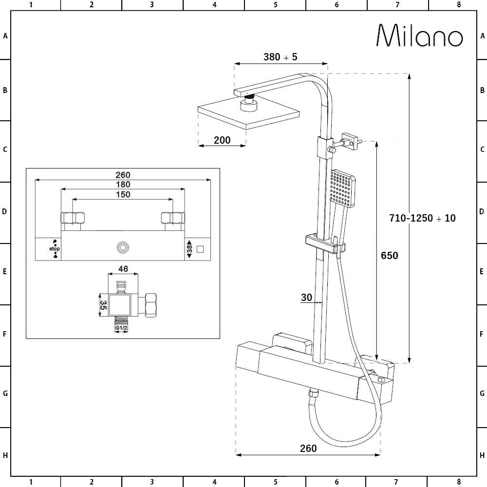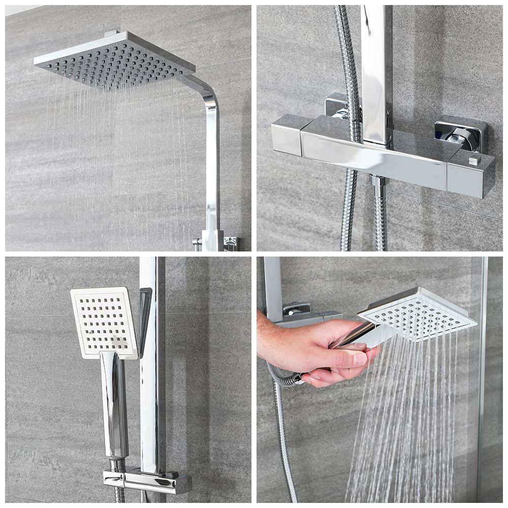 Create a designer look and shower in style with the Milano Arvo thermostatic shower mixer set, complete with bar valve, hand shower and shower head.