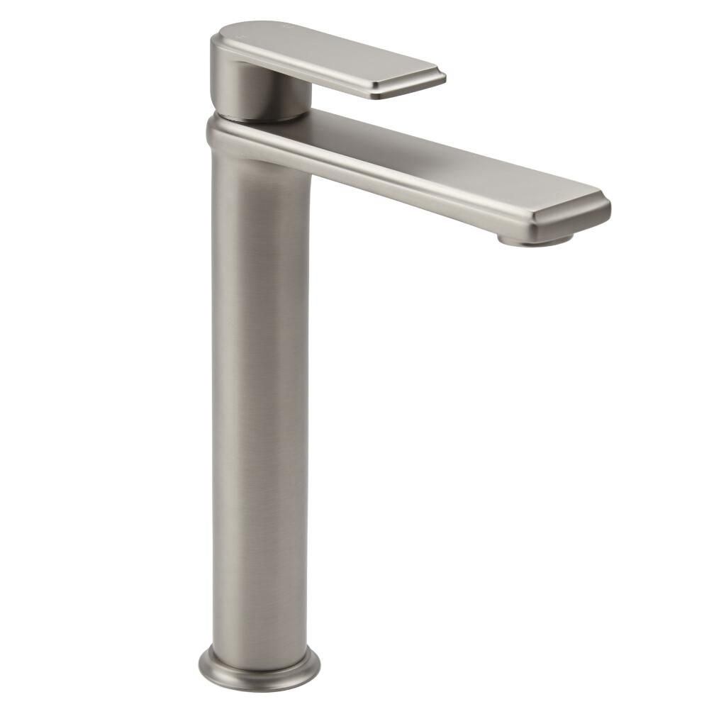 Featuring modern geometric lines and a brushed nickel finish, this bathroom sink tap has been crafted from lead-free solid brass, so you can be assured of quality and durability. Designed for use with a coountertop basin which has no tap-holes, the Ashurst tall basin tap features a single lever handle, so you can control the water flow and temperature with ease.