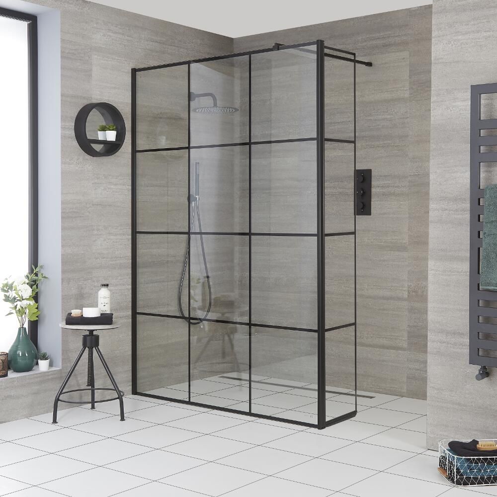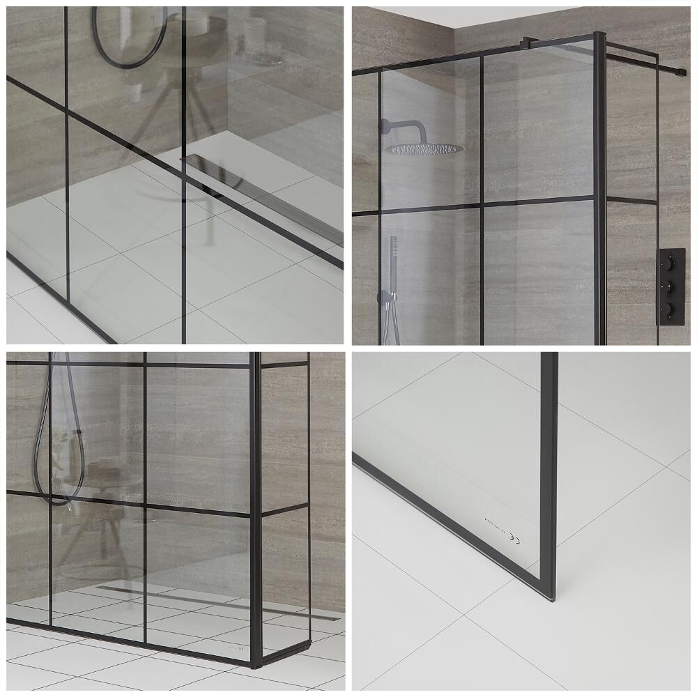 Featuring a black grid pattern design for an eye-catching designer look, the wet room screen uses 8mm toughened safety glass for excellent strength and durability. The glass panel measures 1950mm in height to contain more shower splashes. The grid pattern has been printed on to the outside of the glass, allowing for easier cleaning.