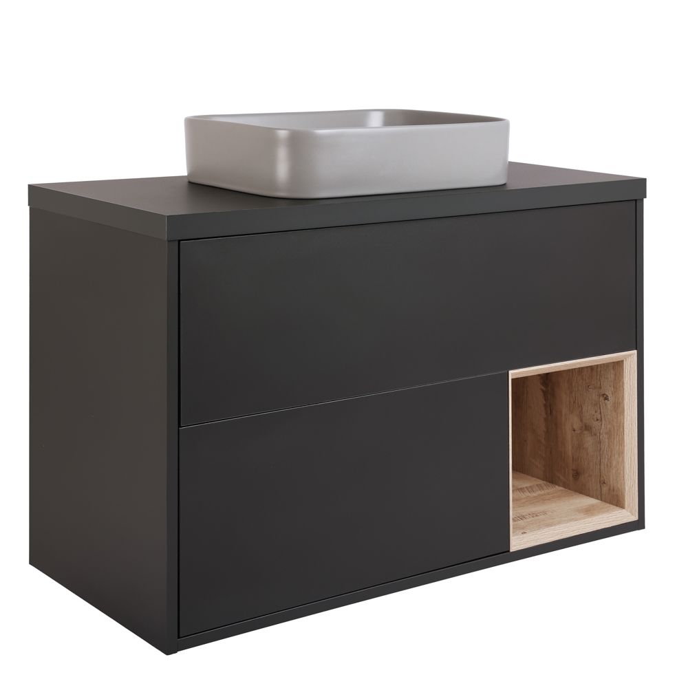 This floating vanity unit gives you ample storage space in the form of two drawers and an open shelf. It features clean lines and a sleek contemporary design.