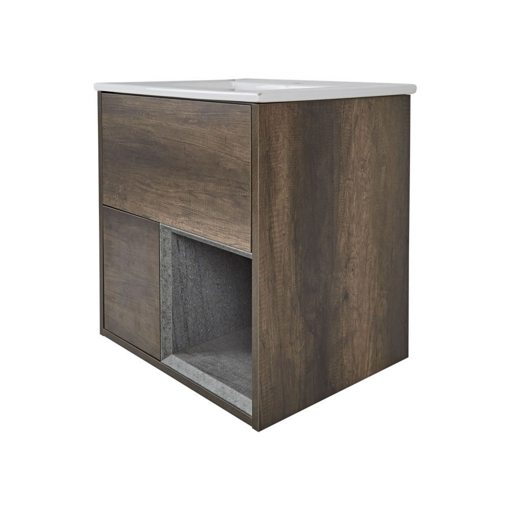 The wall hung vanity unit incorporates two push to open soft close drawers and an open shelf, giving you plenty of storage space for your bathroom essentials. It has a wall-mounted design to enhance a sense of space and comes with the ceramic basin.