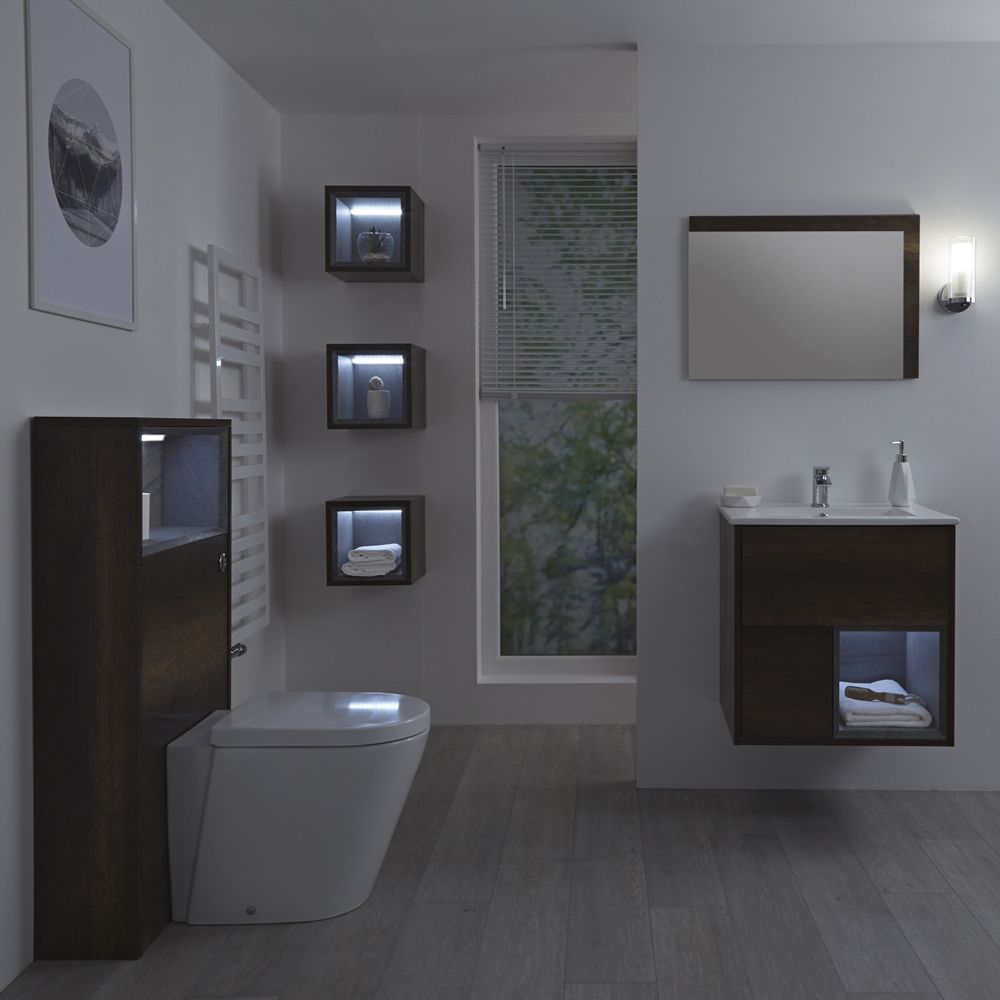 Milano Bexley - Dark Oak Modern 600mm Vanity Unit, WC unit, Rivington Pan, Three Storage Units and Mirror