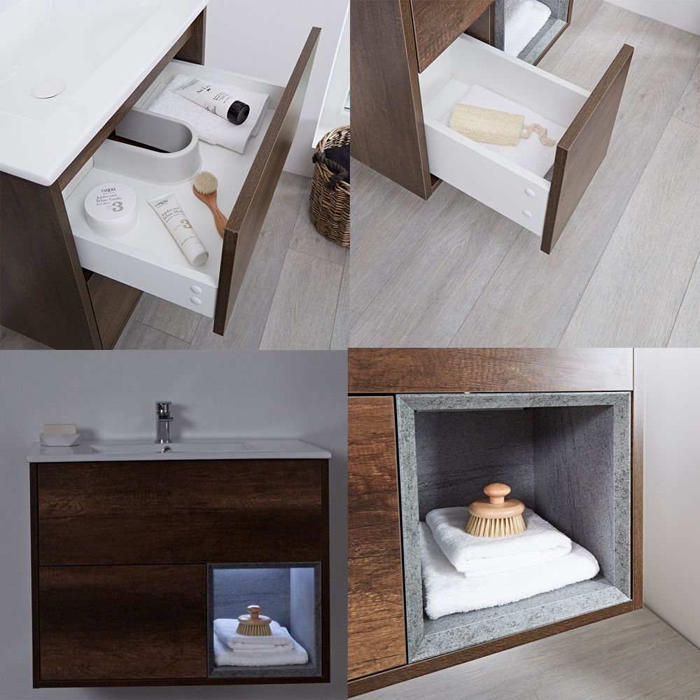 Featuring a rich dark oak woodgrain effect finish for a touch of luxury, and a wall-mounted design to enhance a sense of space, the Bexley vanity sink unit provides a superb storage solution for your bathroom essentials. It incorporates two push to open soft close drawers and an open shelf, giving you plenty of room to keep toiletries and beauty products stored away. The basin has been made from premium quality ceramic and finished in a hard-wearing white glaze that's easy to clean. It has a single tap-hole, so why not complete the look with one of our stylish and modern mono basin taps?