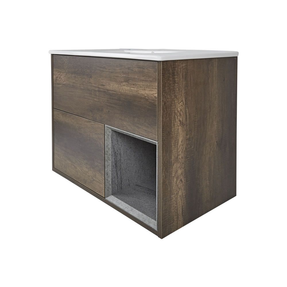 Made from highly durable moisture resistant engineered wood, the vanity sink unit features a gorgeous rich dark oak woodgrain effect finish and a space-enhancing wall-mounted design. There's plenty of storage space for your bathroom essentials too, thanks to the two push to open soft close drawers and an open shelf. The ceramic basin has a hard-wearing white glaze that's easy to clean and a single tap-hole that's perfect for use with any of our stylish and modern mono mixer taps.