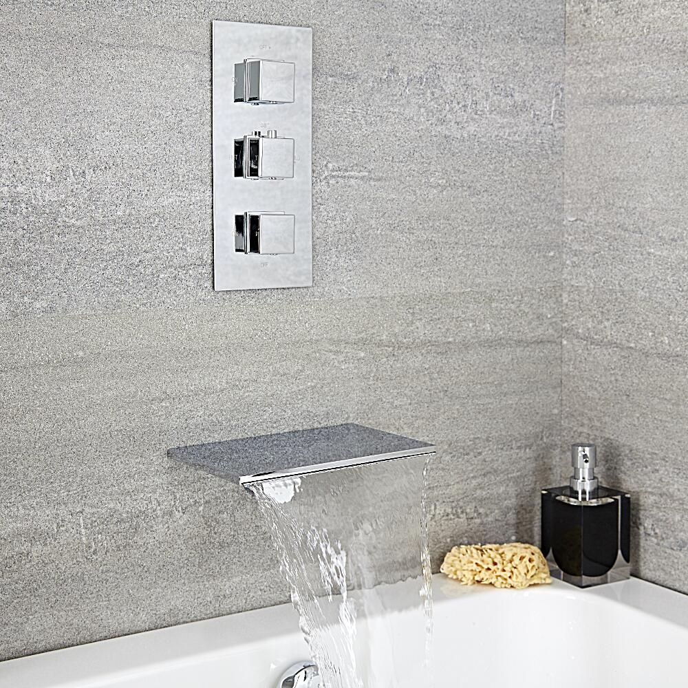 Bring eye-catching designer style to your bathroom and enjoy a luxurious shower and bathing experience with the Milano Blade waterfall bath filler, fixed shower head, hand shower and thermostatic shower valve.