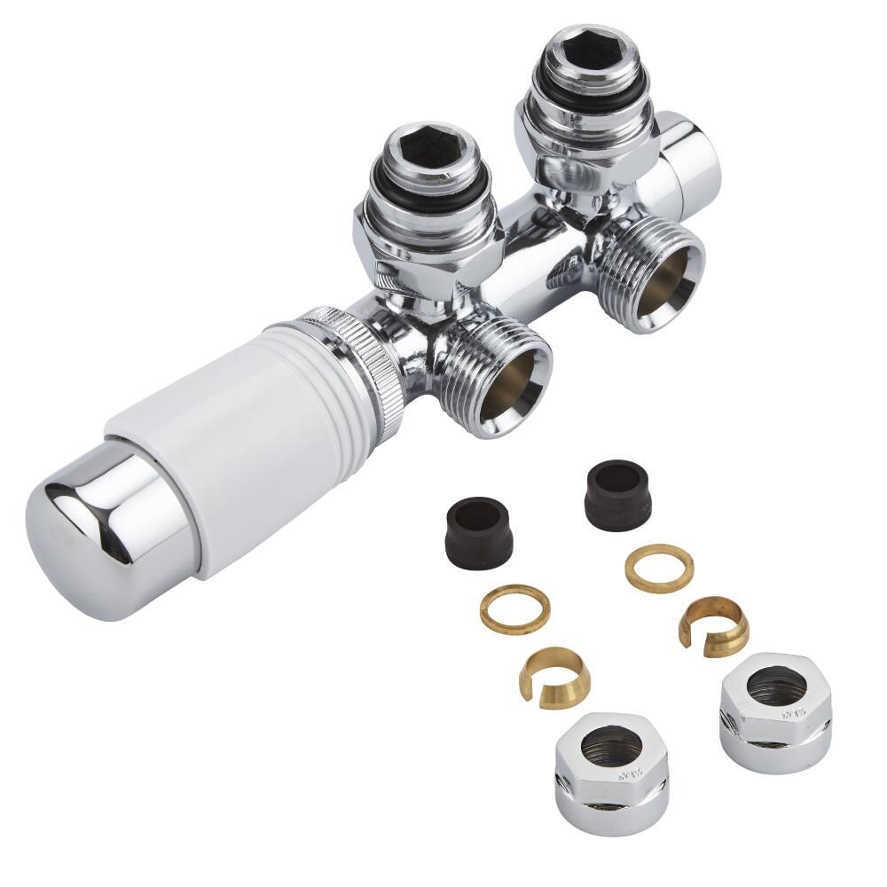 Milano - Chrome H-Block Angled Valve With White TRV Head - 15mm Copper Adapters