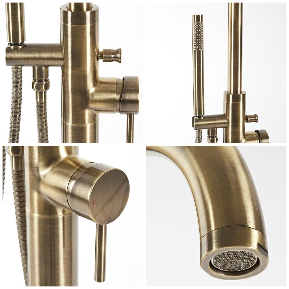 Sure to bring eye-catching designer style to your bathroom, this freestanding bath shower mixer tap features an aged gold finish and smooth curved lines. Perfect for use with freestanding baths, the tap has a solid brass construction, so you can be assured of long-lasting durability. The hand shower and hose makes it easier to rinse and clean around your bath.