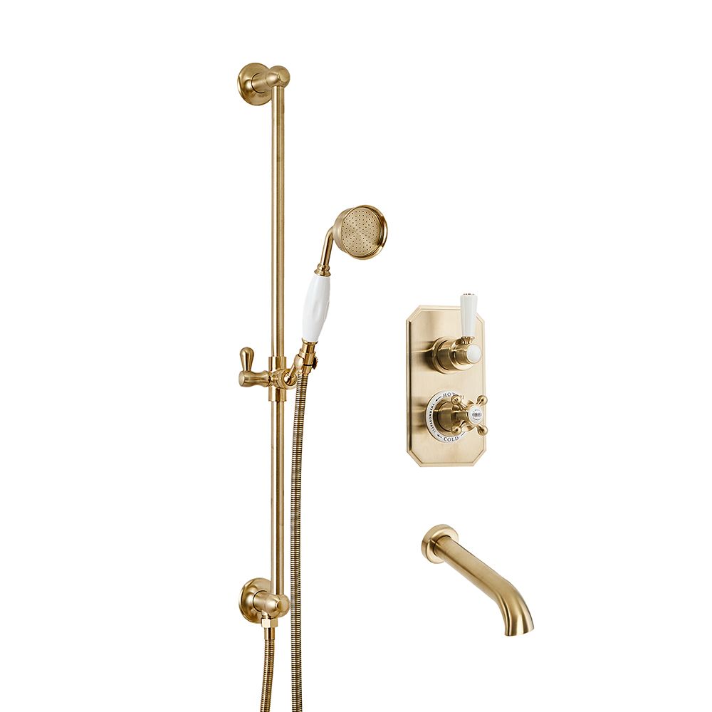 Milano Elizabeth - Brushed Brass Traditional Thermostatic Shower with Diverter, Riser Rail and Bath Spout (2 Outlet)