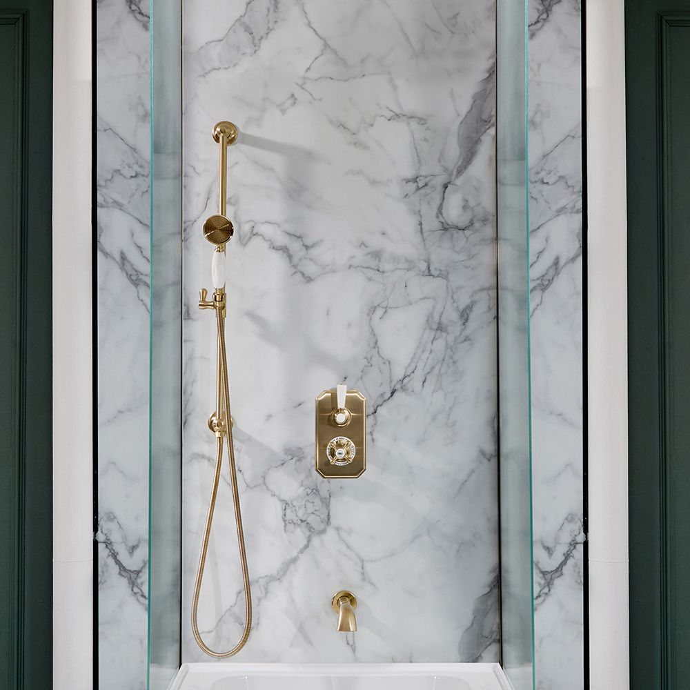 The beautifully designed Milano Elizabeth thermostatic mixer shower will grace your bathroom with class and elegance. Featuring a hard-wearing brushed brass finish and a timeless design, this bath and shower system includes the wall-mounted bath spout, riser rail kit and twin diverter thermostatic shower valve.