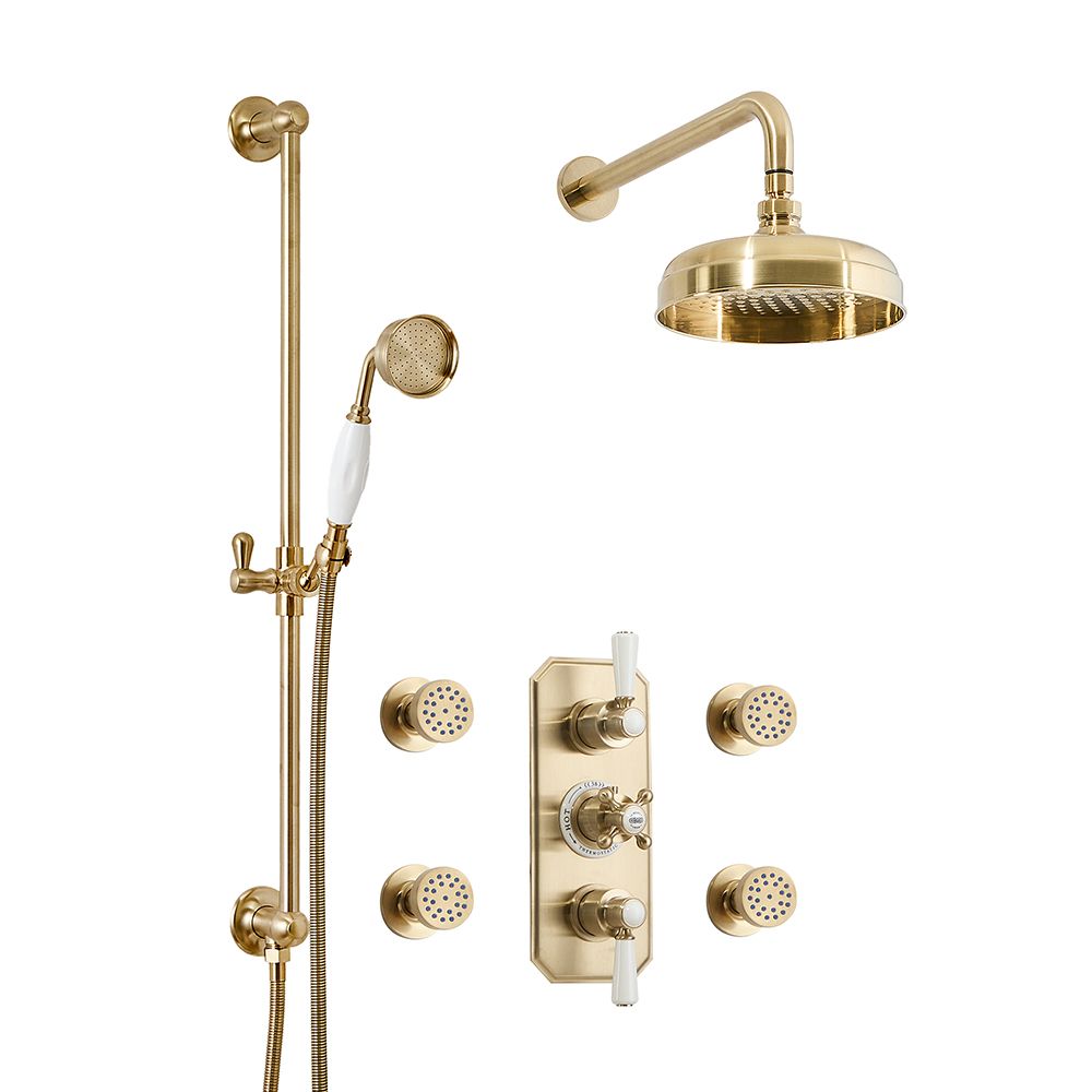 Create a stunning vintage look and enjoy a luxurious shower with the Milano Elizabeth brushed brass thermostatic mixer shower, complete with diverter shower valve, 205mm wall-mounted shower head, body jets and riser rail kit.