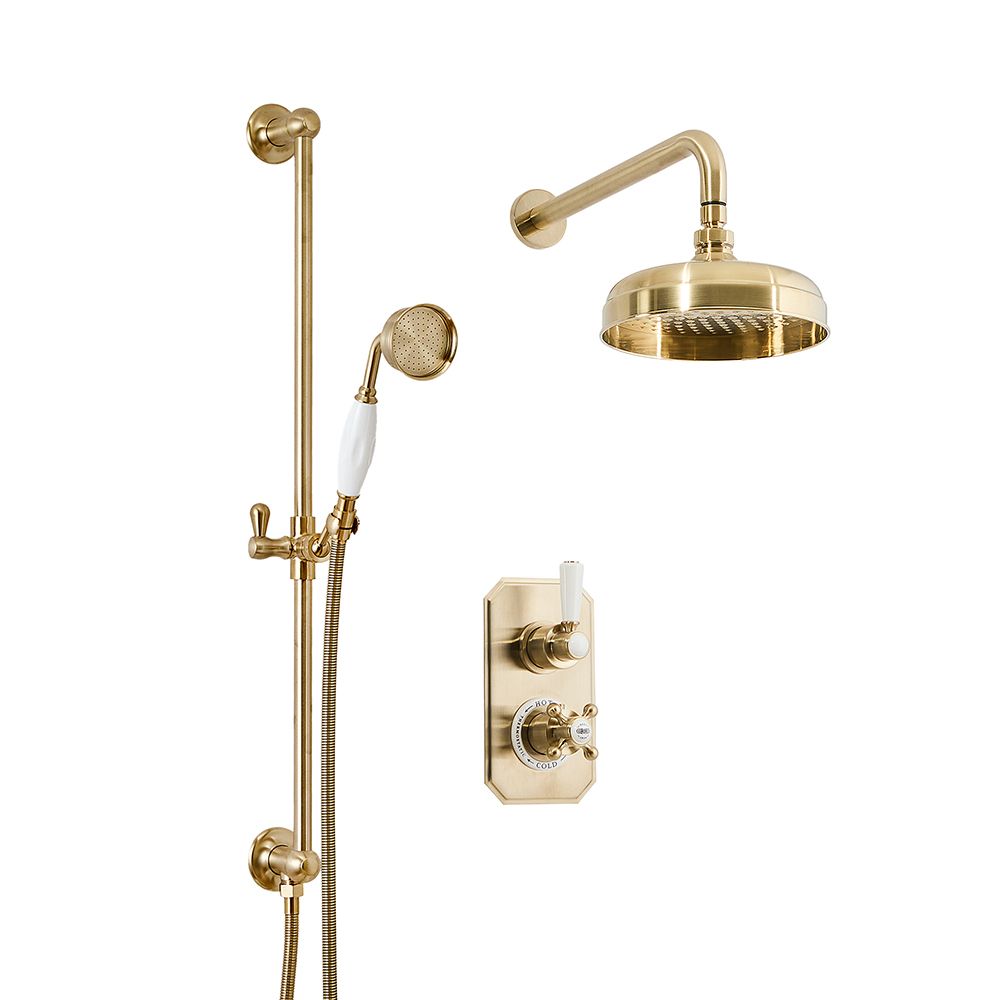 Milano Elizabeth - Brushed Brass Traditional Thermostatic Shower with Diverter, Shower Head, Hand Shower and Riser Rail (2 Outlet)