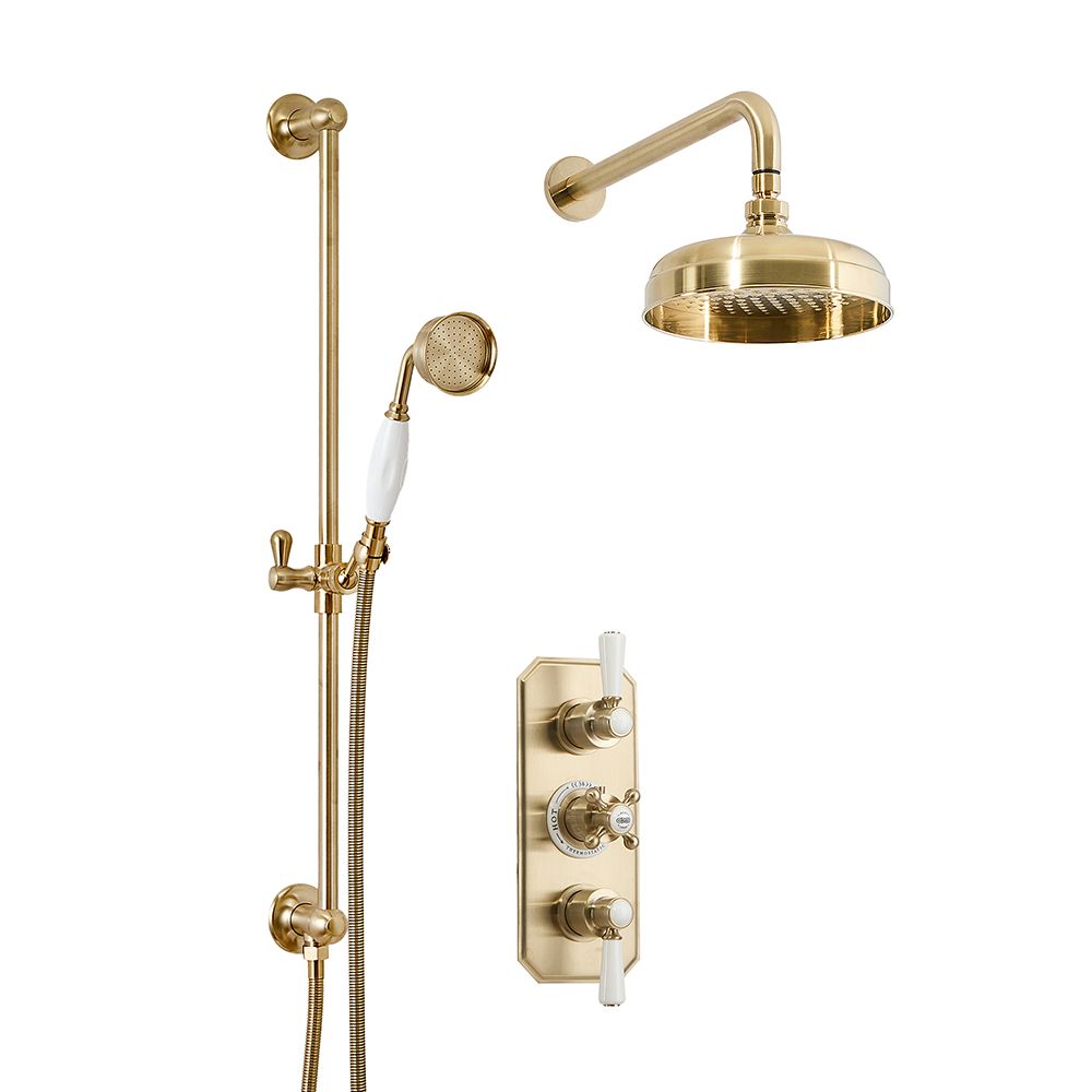 Milano Elizabeth - Brushed Brass Traditional Thermostatic Shower with Riser Rail and Shower Head (2 Outlet)