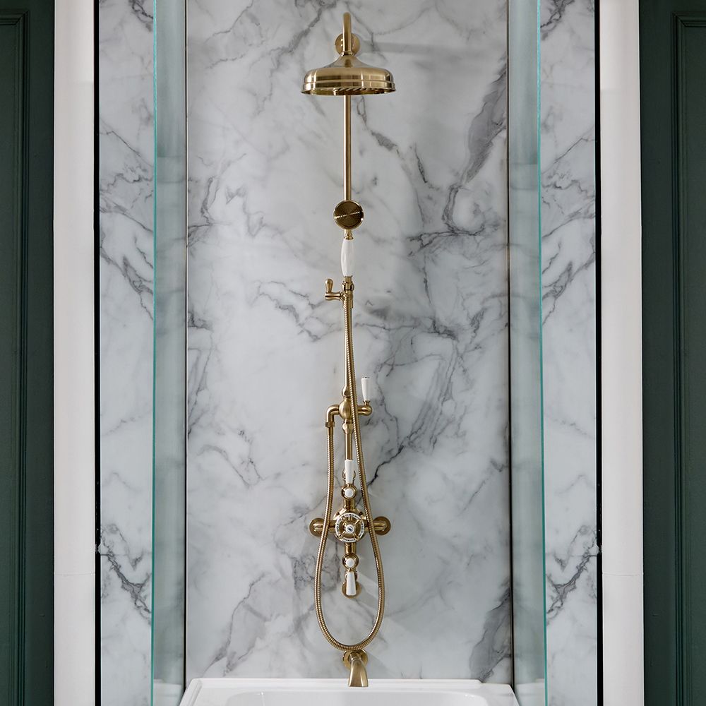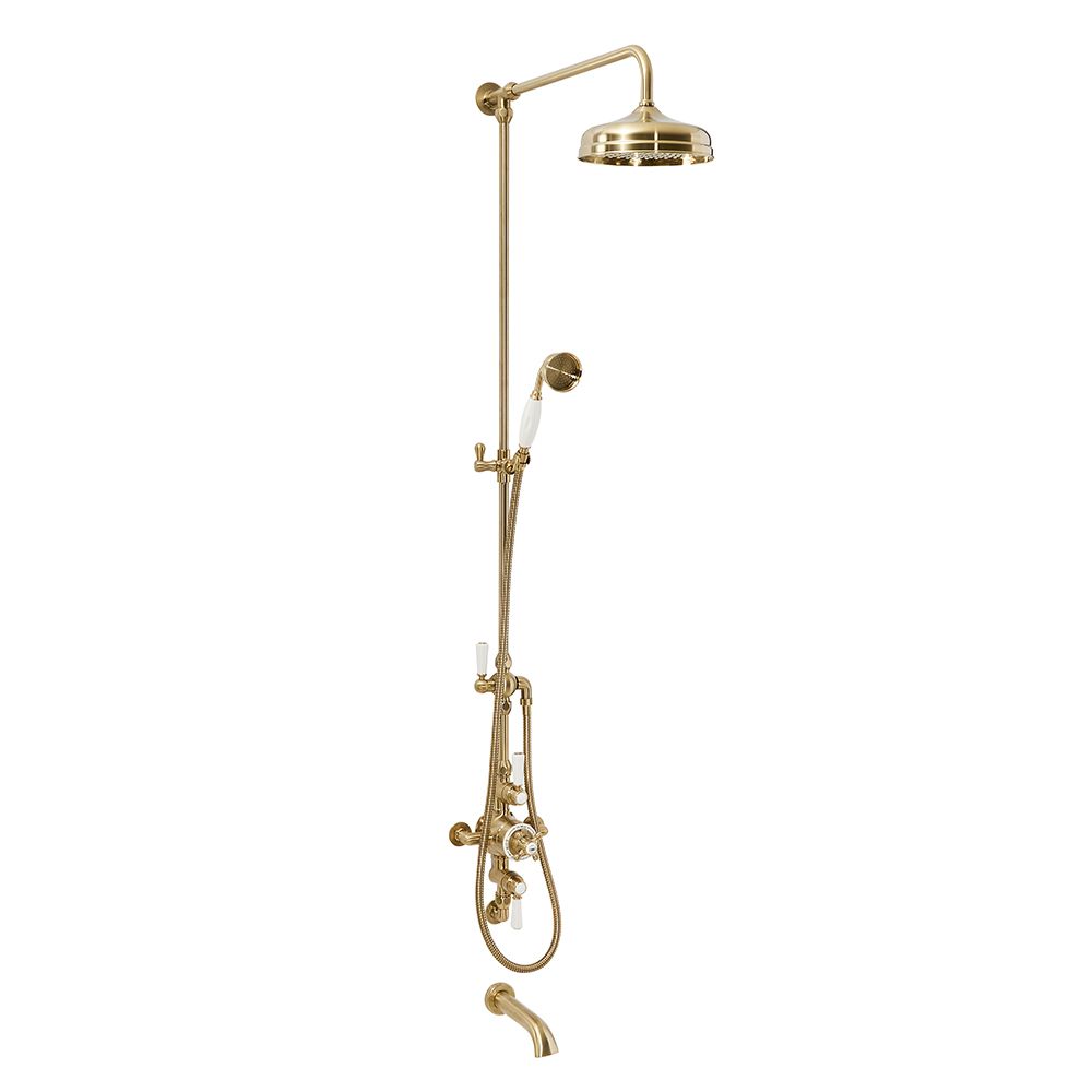 Create a stunning traditional look and enjoy a luxurious shower experience with the Milano Elizabeth brushed brass grand rigid riser kit, complete with triple exposed thermostatic shower valve, shower head, hand shower and wall-mounted bath spout.