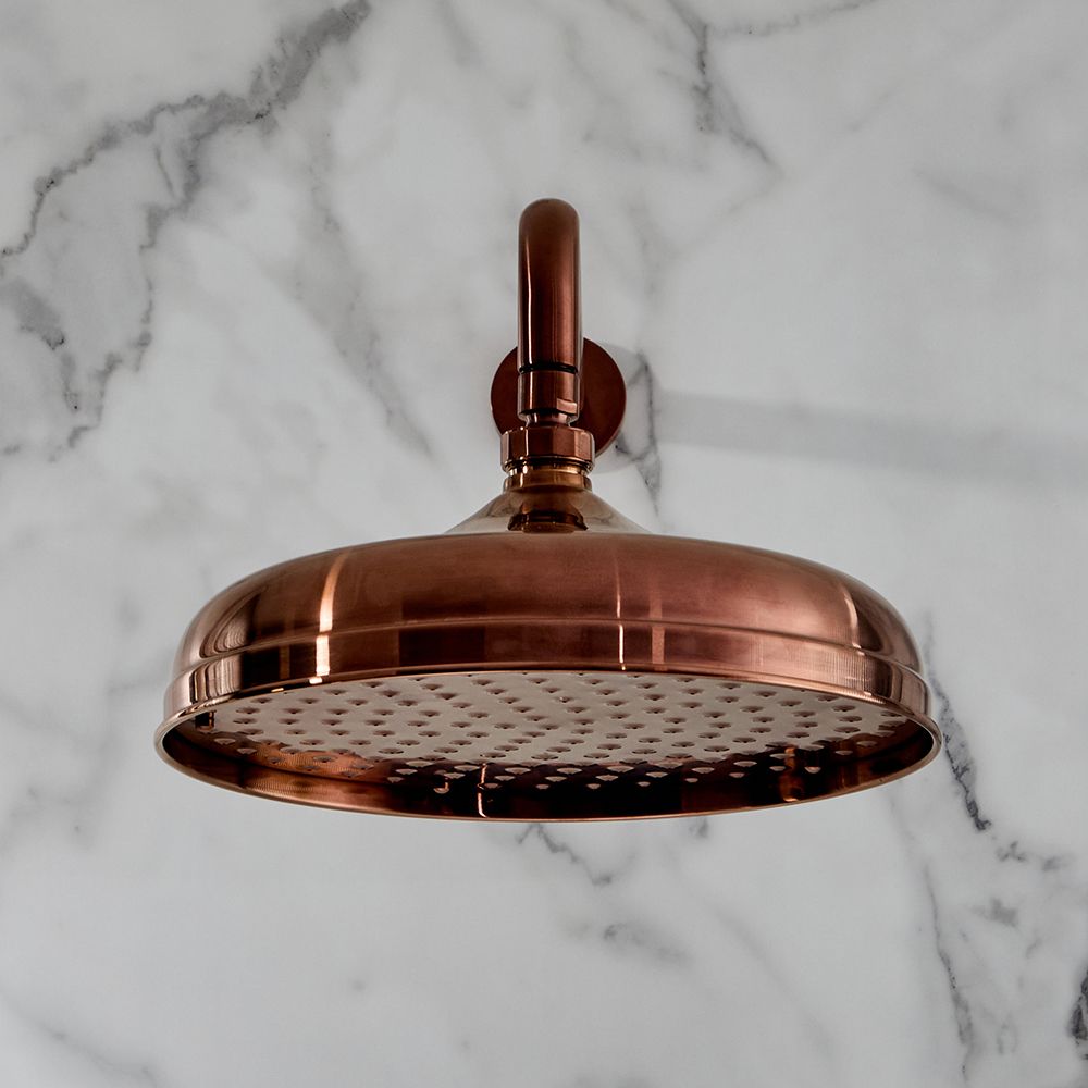 Bring a stunning vintage look to your bathroom with the Milano Elizabeth 300mm round brushed copper apron shower head, complete with wall-mounted arm.