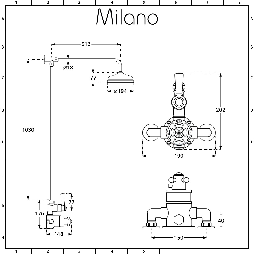 The Milano Elizabeth thermostatic shower, complete with rigid riser, shower head and shower mixer valve, is the perfect choice for traditional bathrooms. It features a hard-wearing chrome finish and an elegant design.