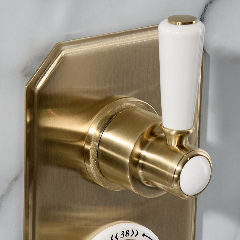 Providing effortless control to two shower outlets independently, such as a hand shower and rainfall shower head, this shower mixer valve uses anti-scald technology, ensuring a safe and comfortable shower every time. Made from solid brass for excellent strength and durability, the Elizabeth shower valve features white ceramic accents and a brushed brass finish for an opulent touch.