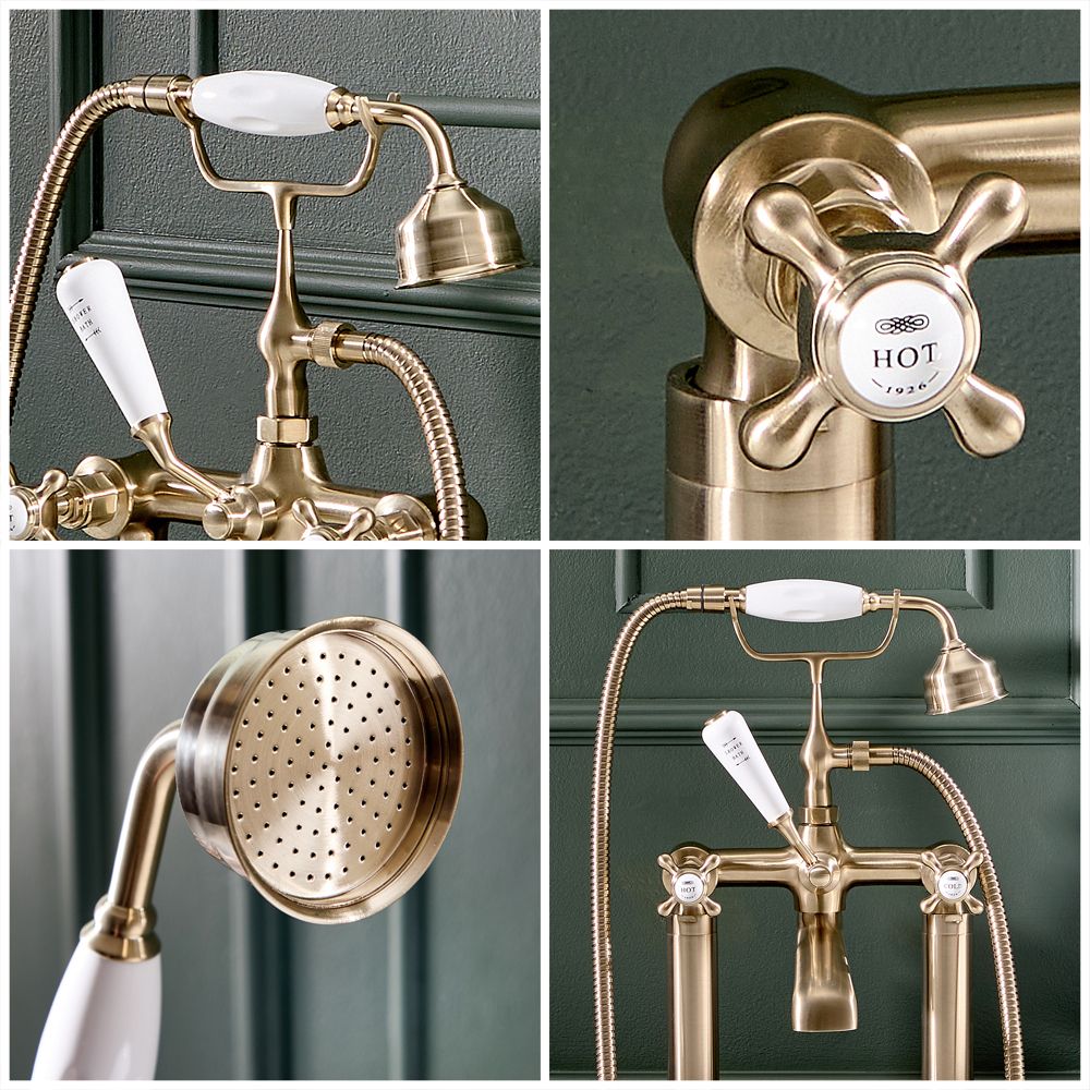 Featuring a hard-wearing brushed brass finish for a touch of opulence, this mixer bath tap with shower has been crafted from solid brass, giving you a long-lasting quality product. The crosshead handles add a classic touch and provide effortless control too.