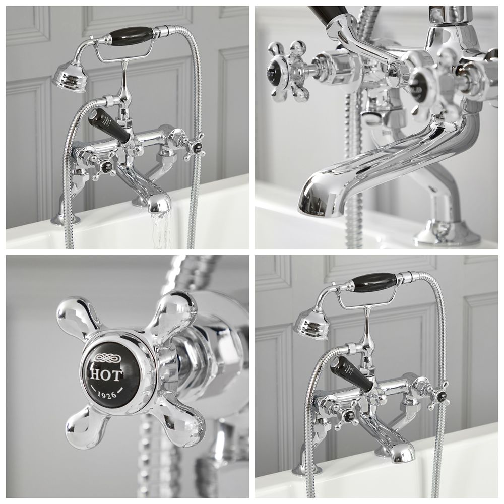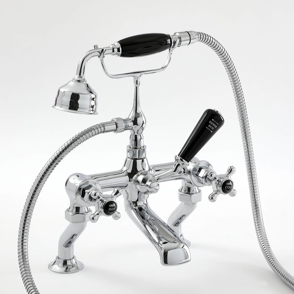 Supplied with the hand shower and 1.5m hose, this bath mixer tap has been crafted from solid brass, giving you a long-lasting quality product. It features crosshead handles with black ceramic indices for a luxurious touch. The easy to use ceramic lever allows you to divert the water flow to the bath spout or hand shower.