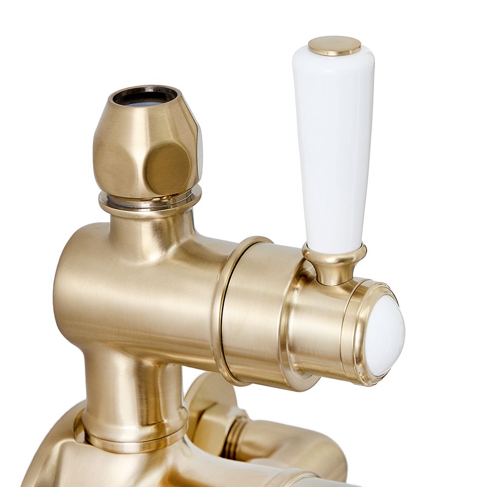 Providing effortless control, this shower mixer valve is specifically designed for use with the Milano Elizabeth grand rigid risers. Made from solid brass for excellent strength and durability, the valve features ergonomic lever and crosshead handles and incorporates anti-scald technology, which automatically cuts the flow if the water rises above a pre-set maximum temperature, ensuring a safe and comfortable shower every time. It also has a stunning brushed brass finish, bringing a touch of opulence to your bathroom.