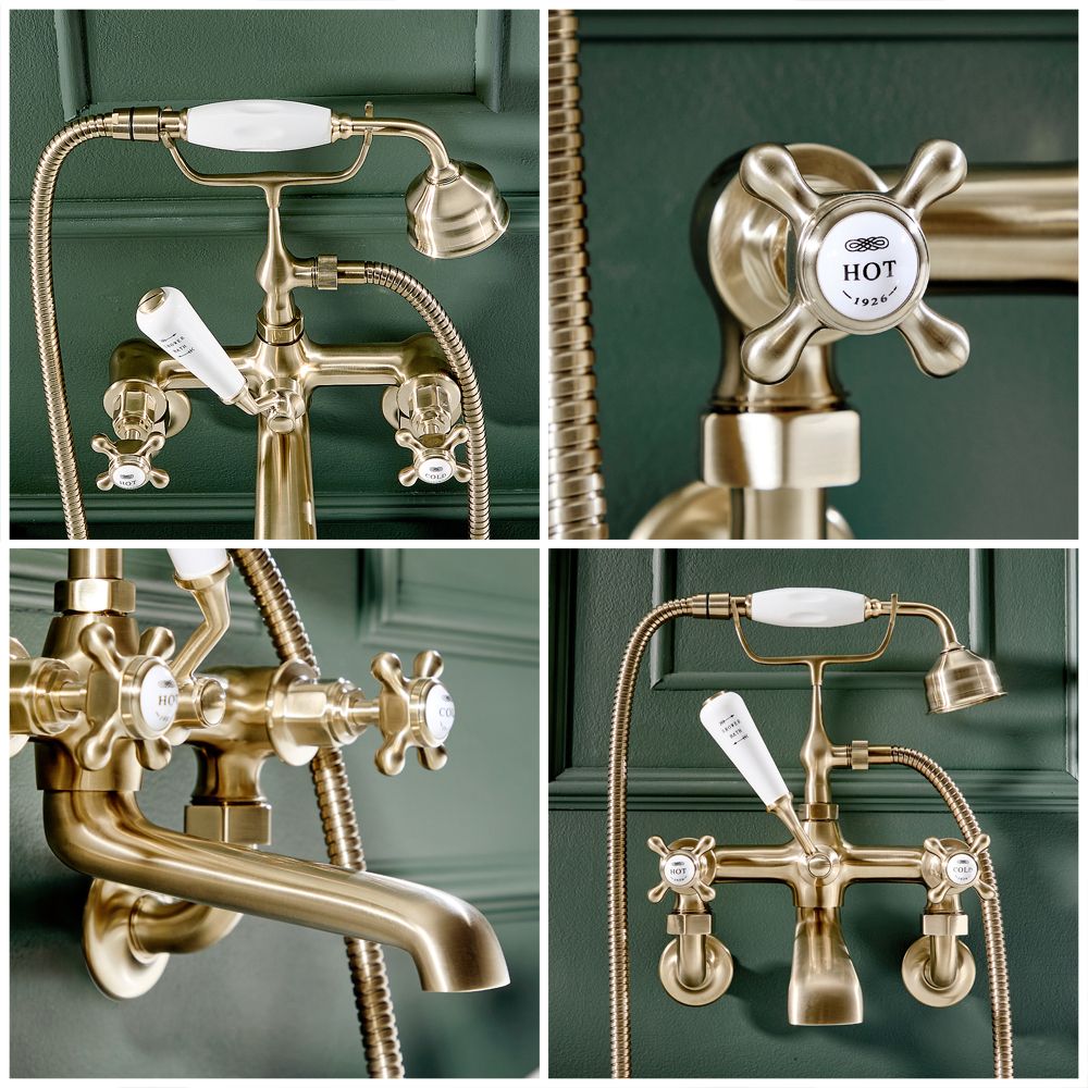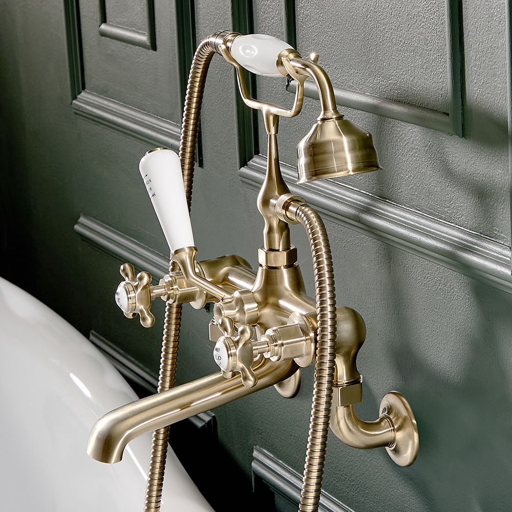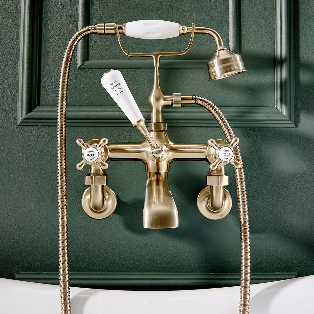 Crafted from solid brass, this bath mixer tap with shower features a stunning brushed brass finish, that's highly resilient, and crosshead handles with detailed ceramic indices for a truly timeless look. The wall-mounted design also frees up surface space around your bath, creating a neater finish.