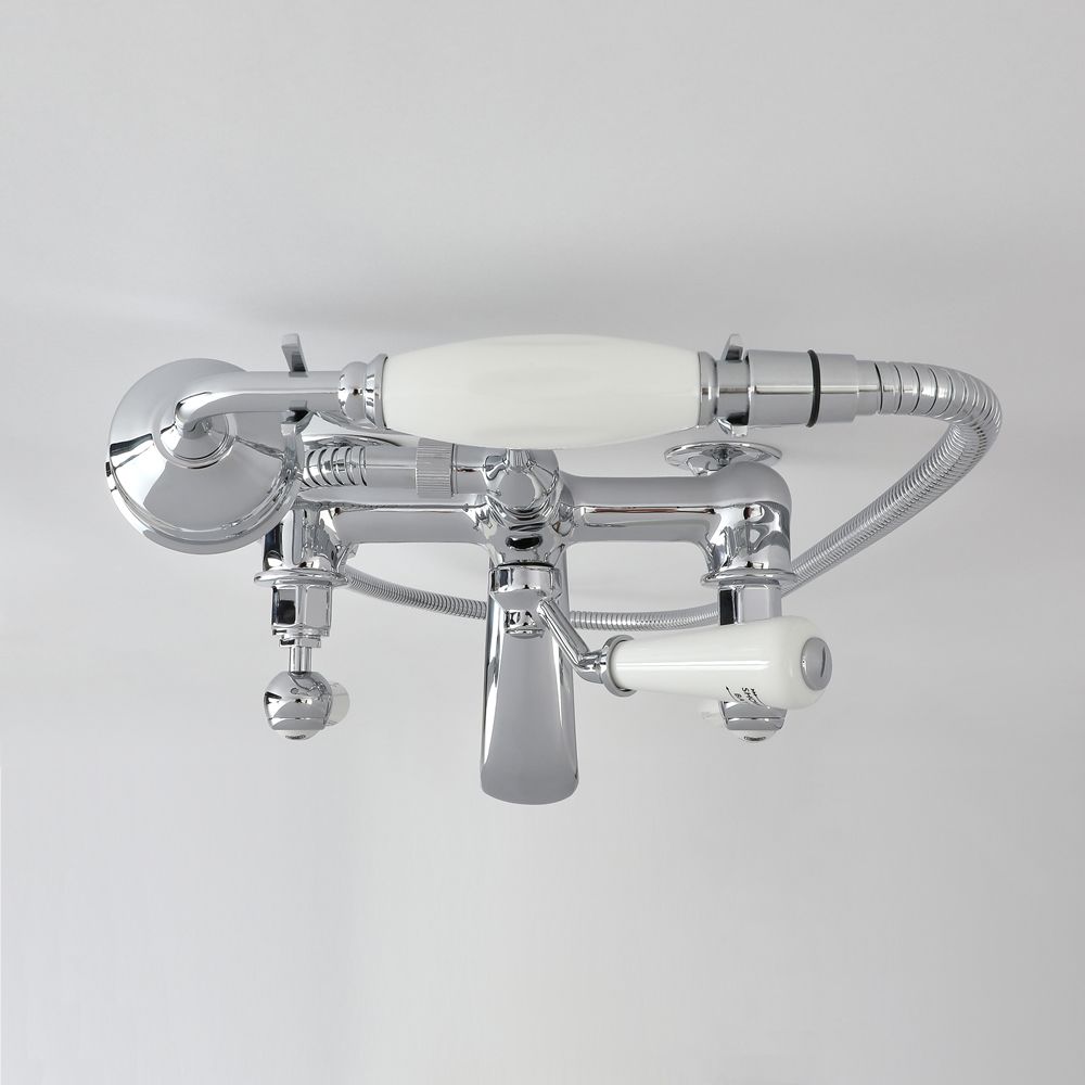 Crafted from solid brass, this bath shower mixer tap, complete with hand shower and 1.5m hose, features stylish white ceramic lever handles that provide effortless control and an elegant design that will never go out of fashion. The hard-wearing chrome finish complements any bathroom decor, while the wall-mounted design will free up surface space around your bath, creating a neat and tidy finish.