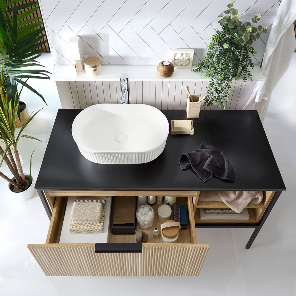 This vanity unit features a stylish reeded drawer front, bringing texture and interest to your bathroom, while the light oak finish and black engineered stone worktop create a striking contrast. The fluted vanity unit also incorporates ample storage space for your bathroom essentials. What's more, the highly durable countertop is stain resistant, waterproof and can withstand high humidity levels too.