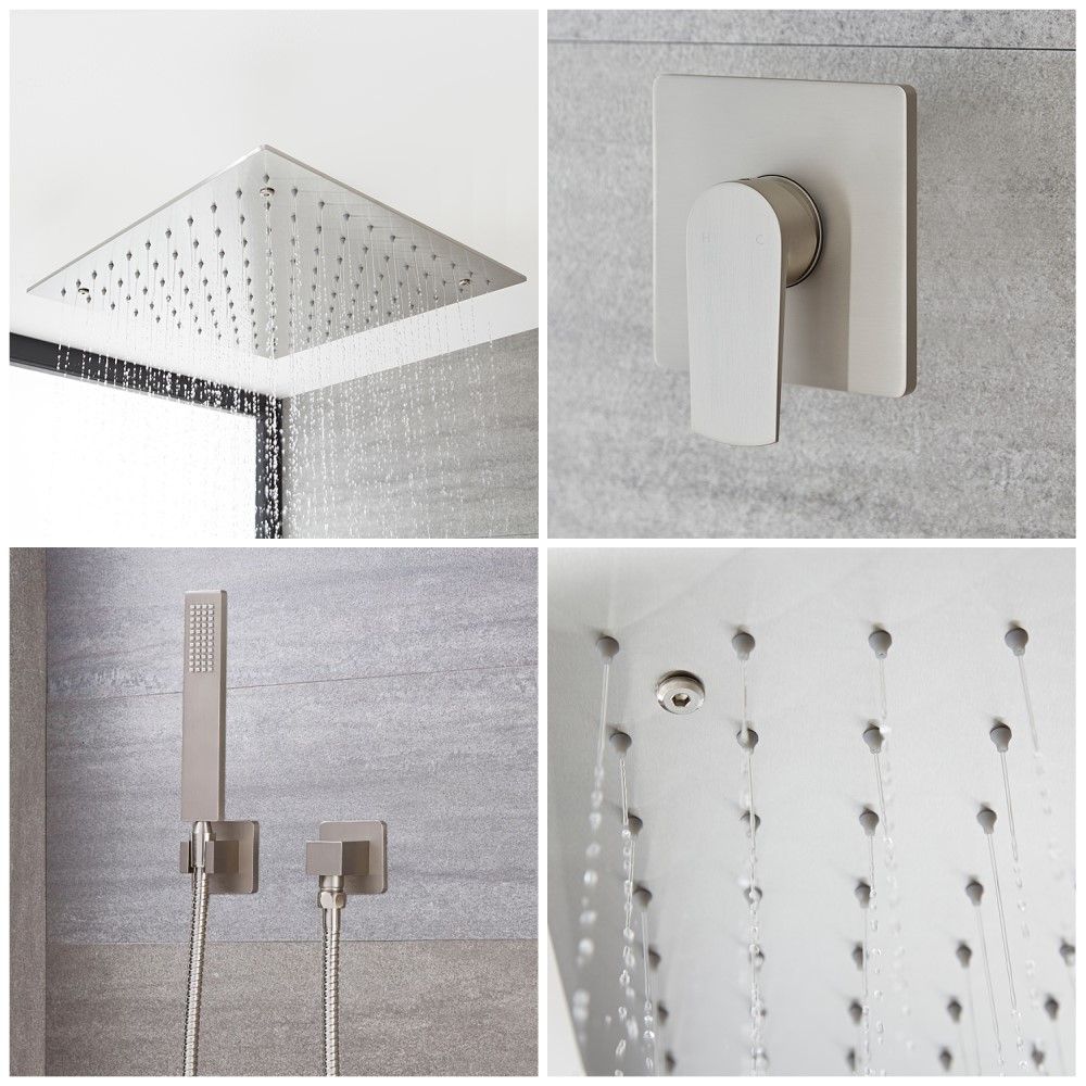 Update your bathroom and create a contemporary look with the Milano Hunston brushed nickel shower system, complete with shower mixer valve, 400mm recessed rainfall shower head and hand shower kit.