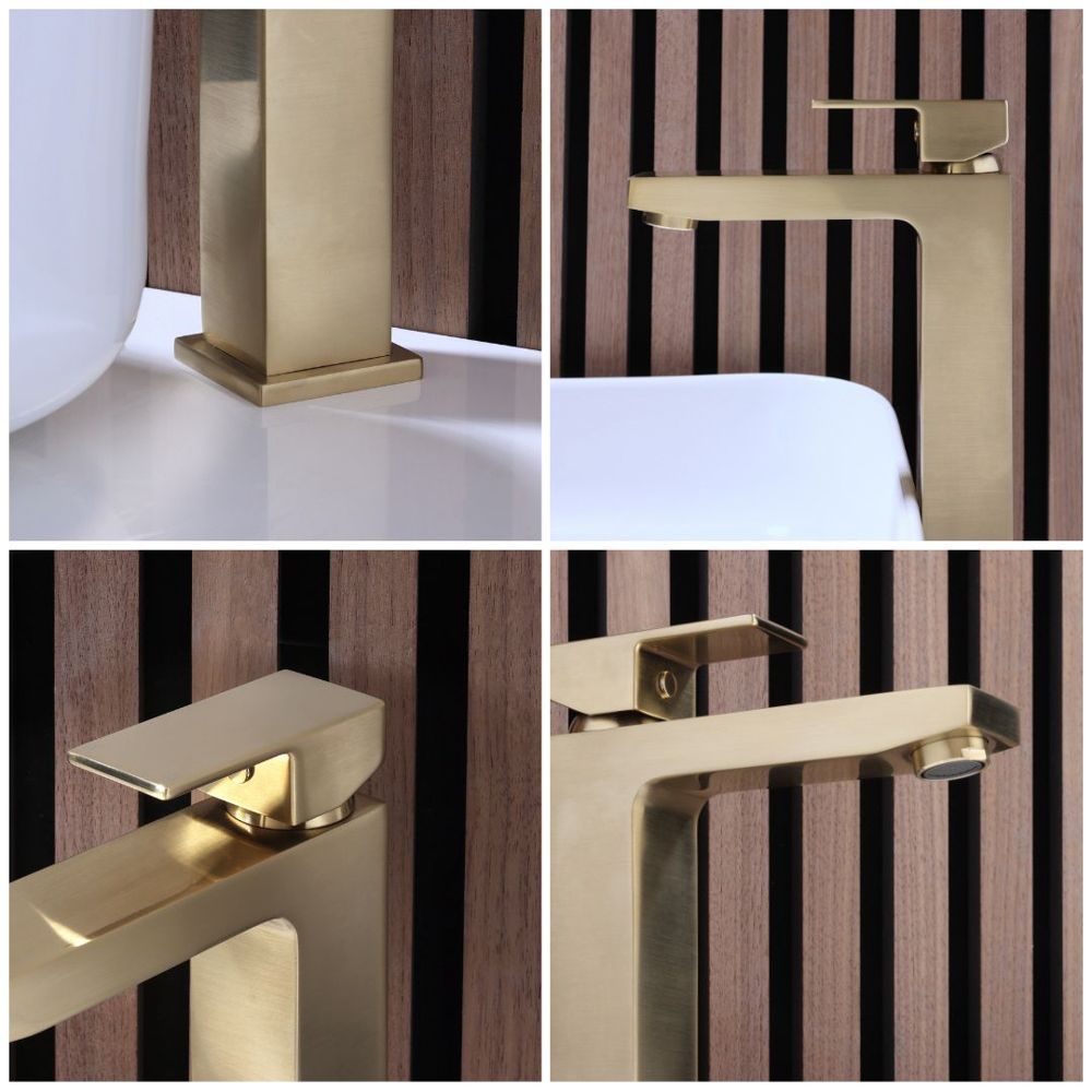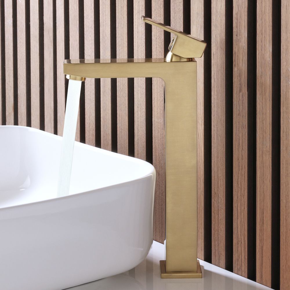 Perfect for use with countertop basins, this tall mixer tap features a stunning brushed brass finish and sleek square lines. Made from brass for a quality feel and long-lasting durability, the high rise tap has a single lever handle for easy control over the water flow and temperature.