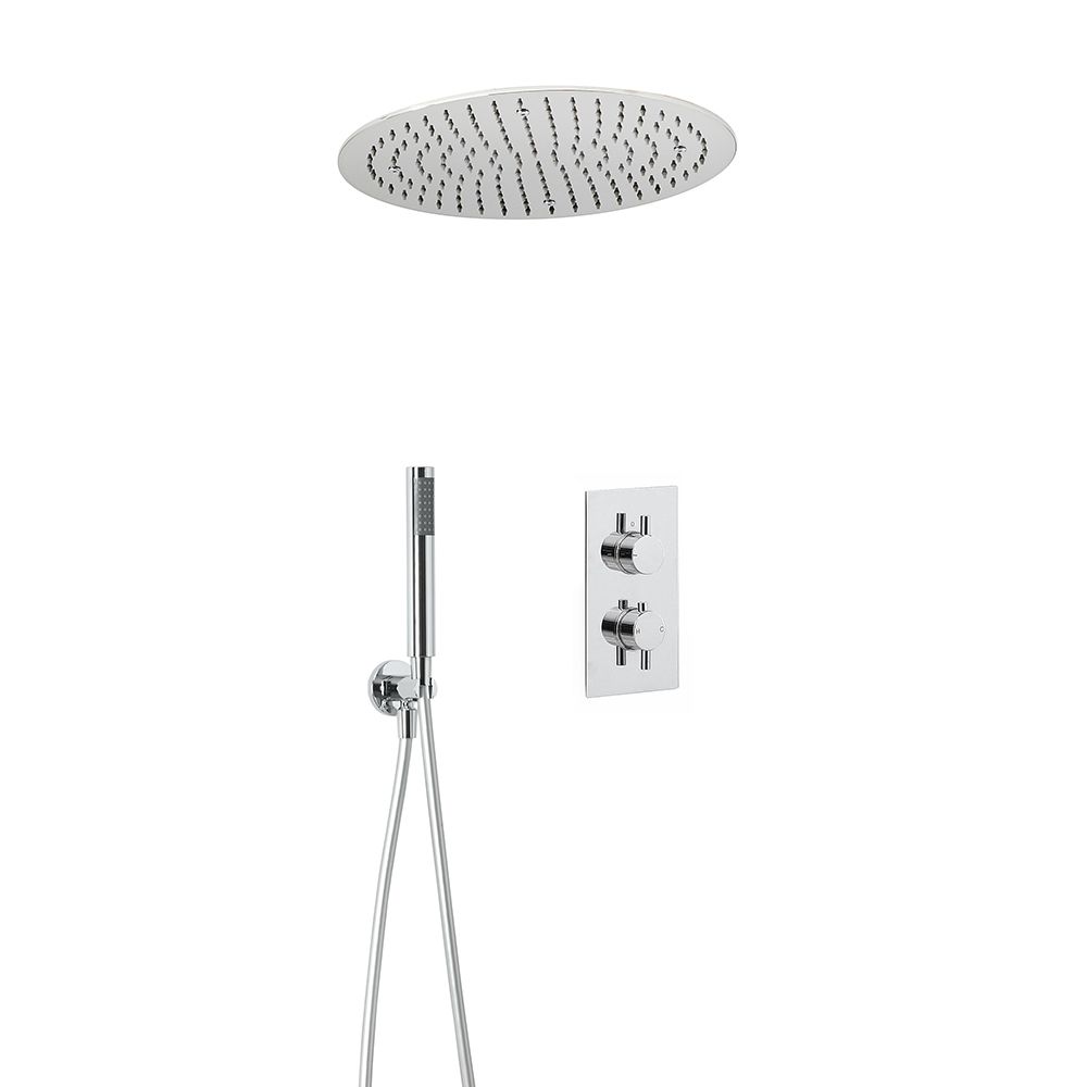 Create a stylish modern look and enjoy a luxurious showering experience with the Milano Mirage two outlet thermostatic mixer shower, complete with shower diverter valve, 400mm round recessed ceiling rainfall shower head and hand shower kit.
