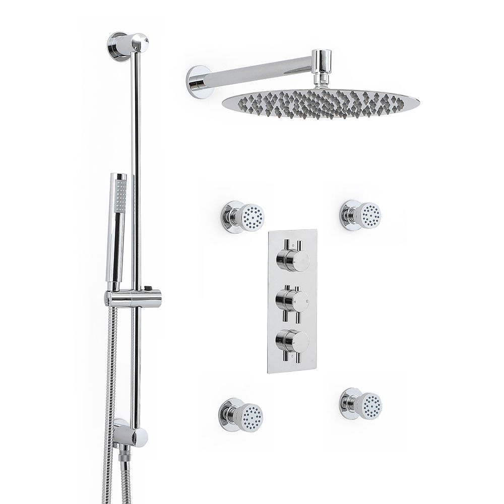 Create a designer look and enjoy a sensational showering experience with the Milano Mirage thermostatic mixer shower, complete with shower diverter valve, 300mm round shower head, body jets and riser rail kit.
