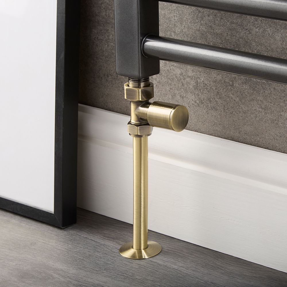 The brushed gold pipe connectors allow for a neat connection between the inlet of the radiator valve and the floor. The finish matches the radiator valves, creating a coordinated look.