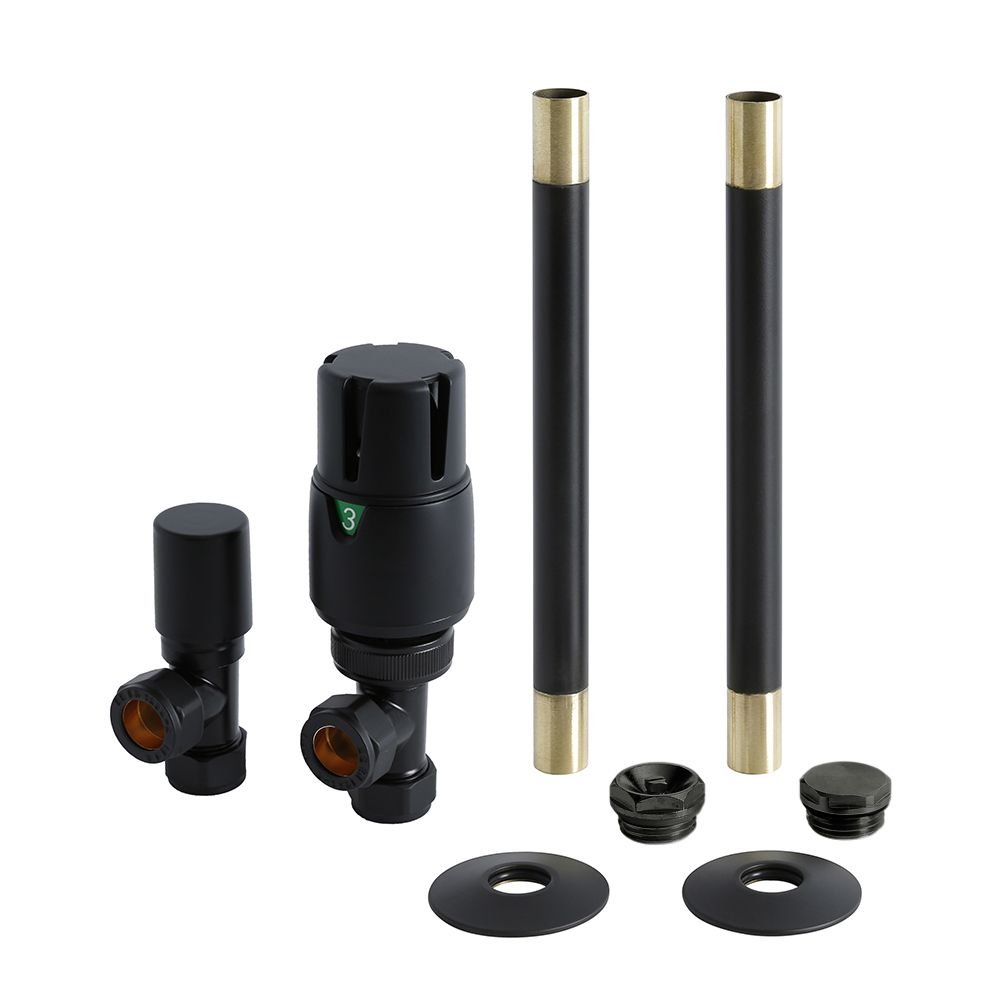 Add the stylish finishing touches to your new radiator or heated towel rail with the Milano modern thermostatic angled radiator valve and pipe connector set.