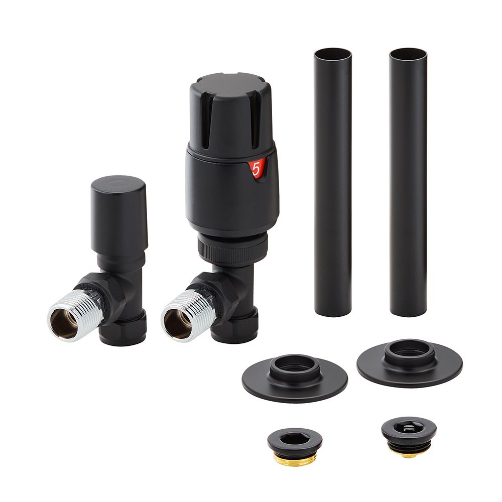 Milano - Modern Thermostatic Angled Radiator Valve and Pipe Sleeve Set - Choice of Finish