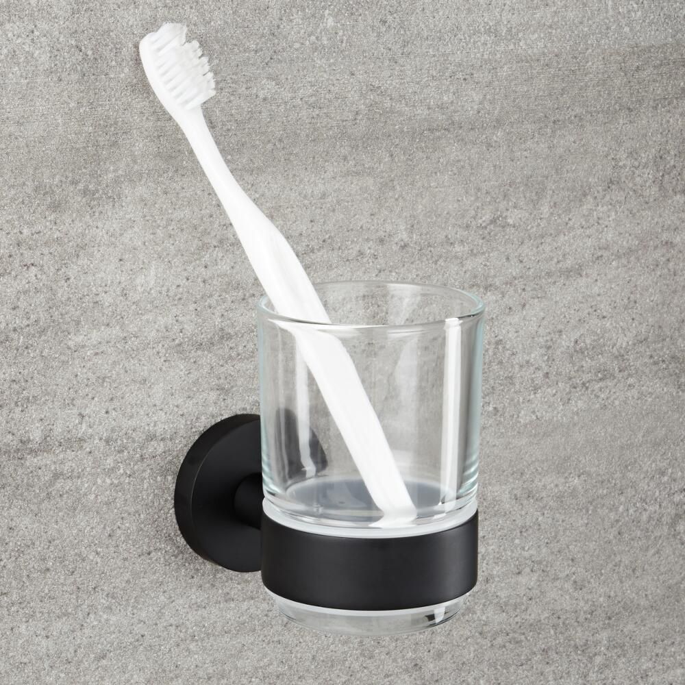 Featuring a hard-wearing matt black finish for a contemporary look and a sleek modern design, this wall-mounted tumbler and holder provides a stylish and practical way to store toothbrushes and toothpaste, ensuring your basin area is kept clear from clutter.