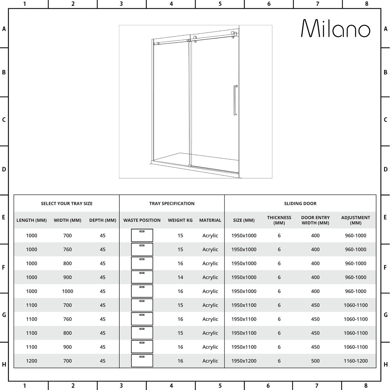 Milano Portland - Chrome Frameless Sliding Shower Door with Tray - Choice of Size