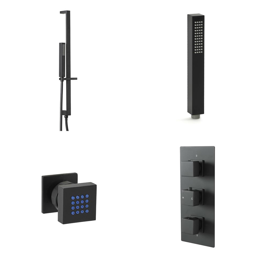 With the Milano Preto matt black thermostatic shower set you get stylish contemporary looks and a superb shower experience. The triple shower mixer valve, four body jets and riser rail kit with hand shower and ribbed hose are included.