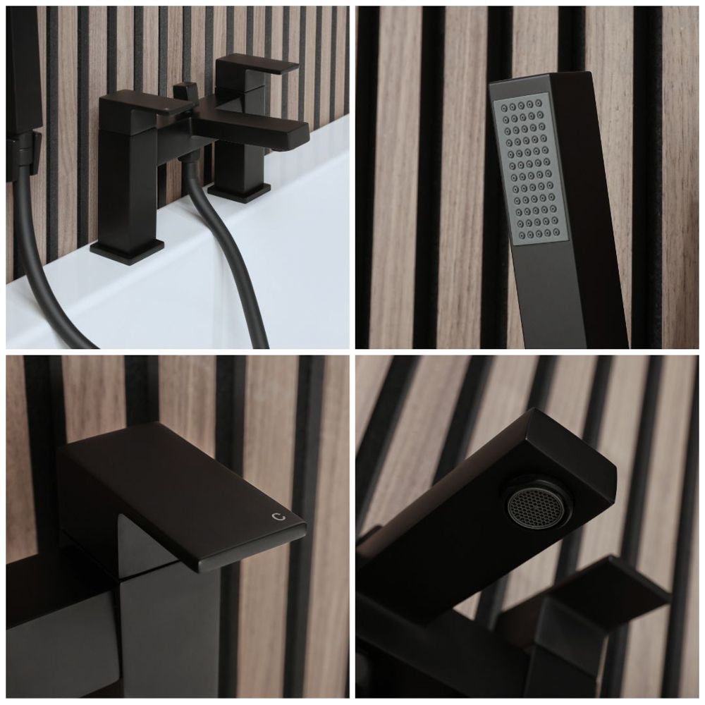 This bath mixer tap with shower features stylish square lines and a hard-wearing matt black finish for an eye-catching look. It has been made from brass for a luxury feel and long-lasting durability.