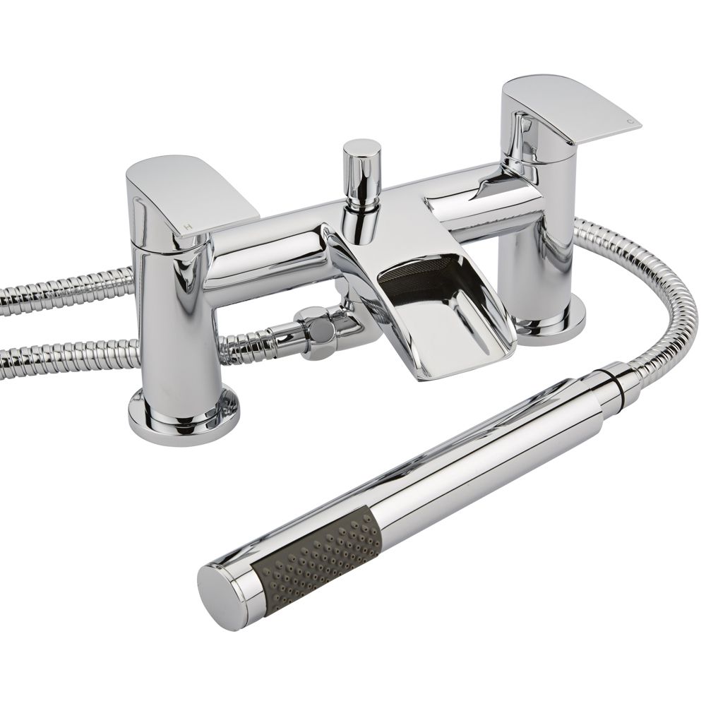 Boasting a waterfall spout and curved lines, the Razor bath shower mixer tap has been crafted from solid brass, so you can be assured of quality and durability. The hard-wearing chrome finish complements any bathroom decor. The lever handles provide effortless control, while the hand shower delivers a refreshing spray of water.