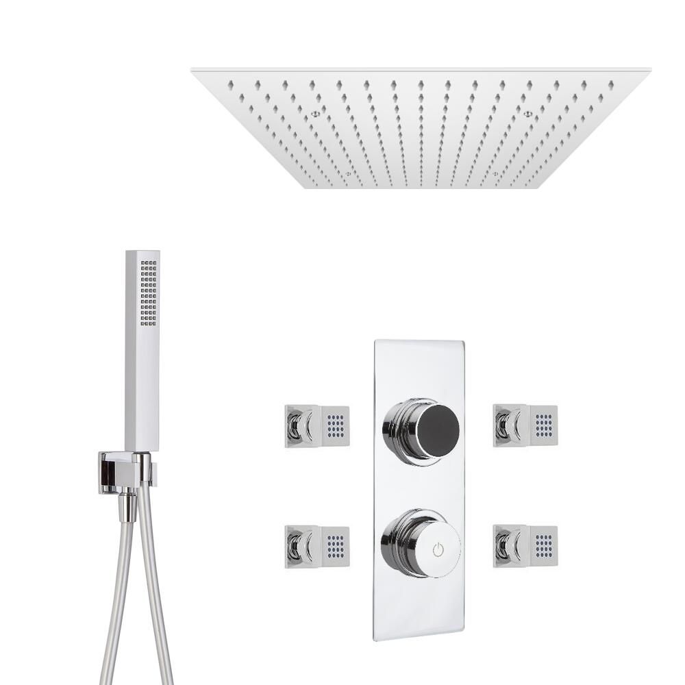 Give your bathroom a designer edge and enjoy the ultimate spa-like showering experience with the Milano Vis thermostatic digital mixer shower, complete with recessed rainfall shower head, hand shower kit and body jets.