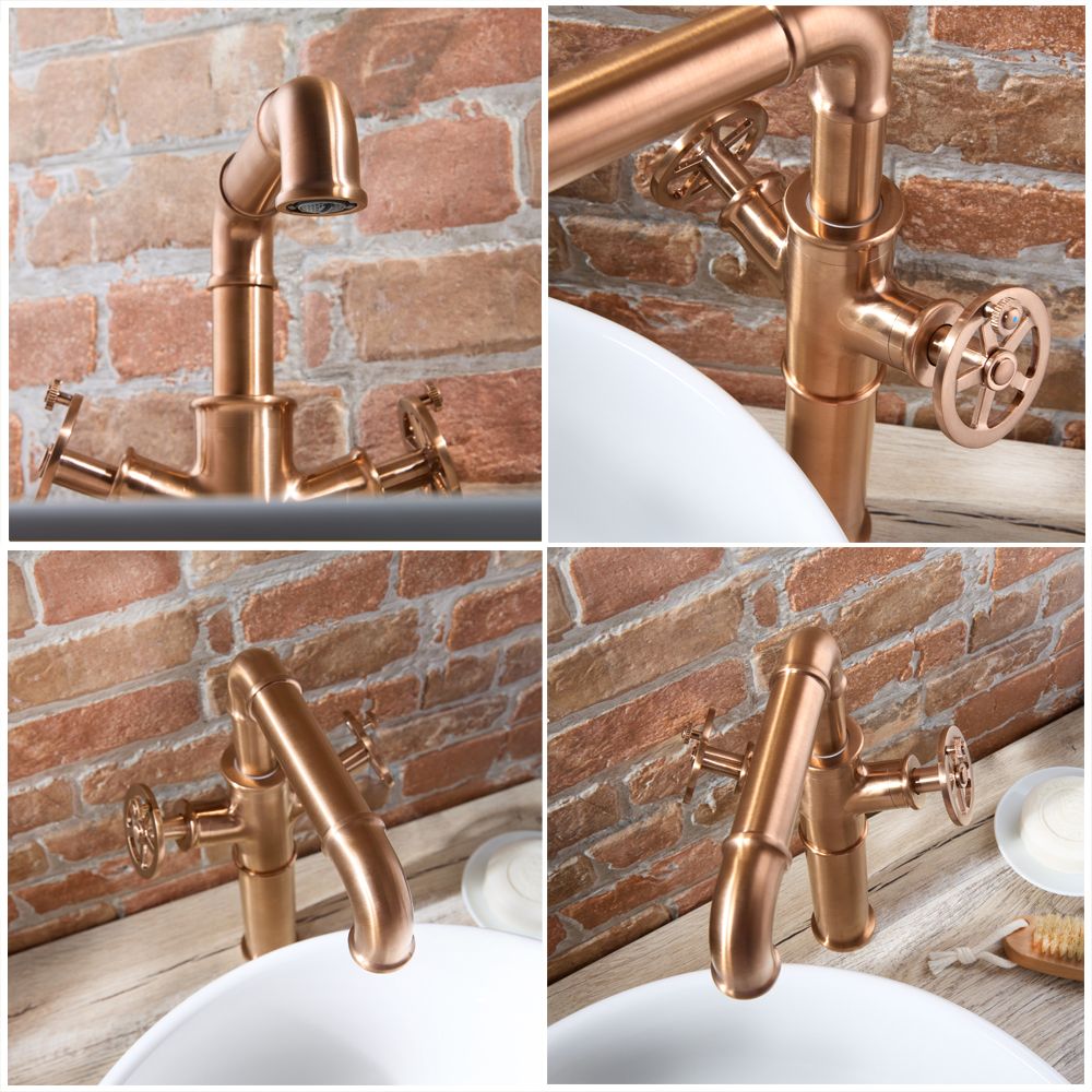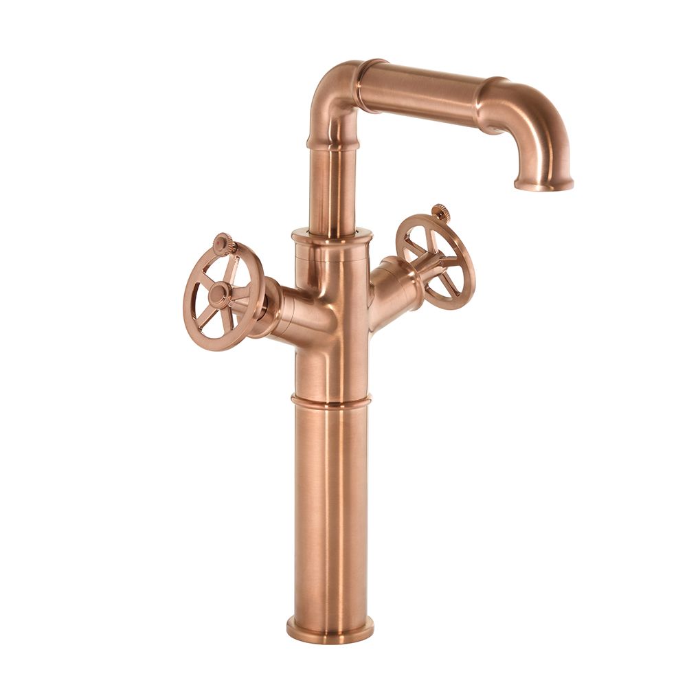 This solid brass bathroom sink tap blends Victorian elegance with bold industrial elements. It has a brushed copper finish and and stylish circular handles, which provide effortless control. The tall design of this tap makes it ideal for pairing with one of our countertop basins for an eye-catching feature.