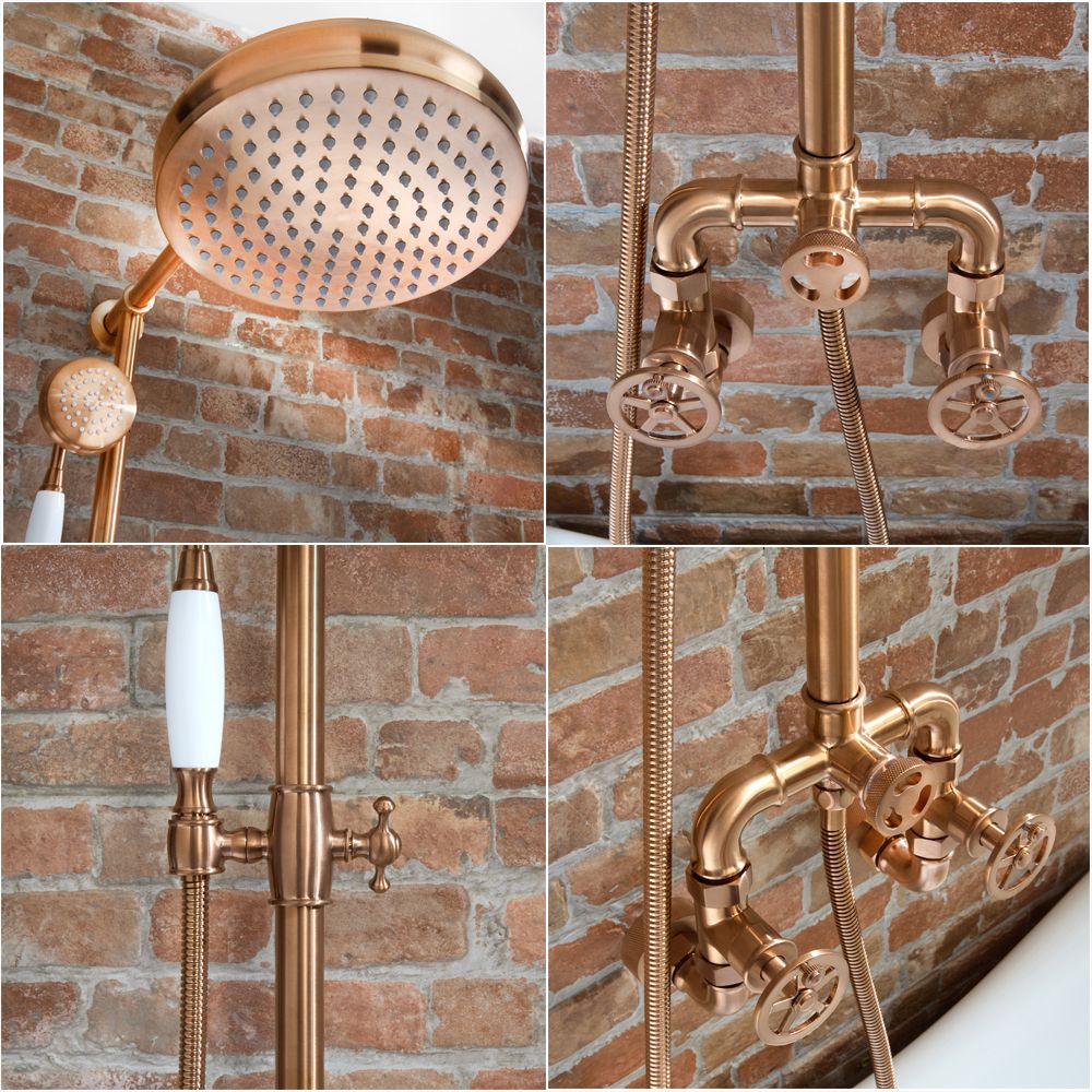 This shower set combines Victorian elegance with bold industrial elements for a unique and interesting look. It features a brushed copper finish and circular handles, which provide effortless control.