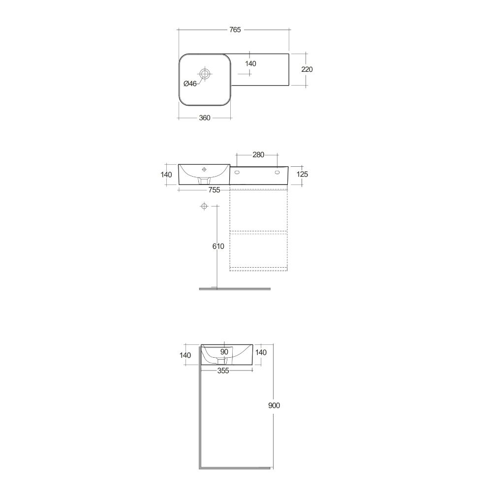 - Dimensions: W 765mm x D 360mm x H 140mm